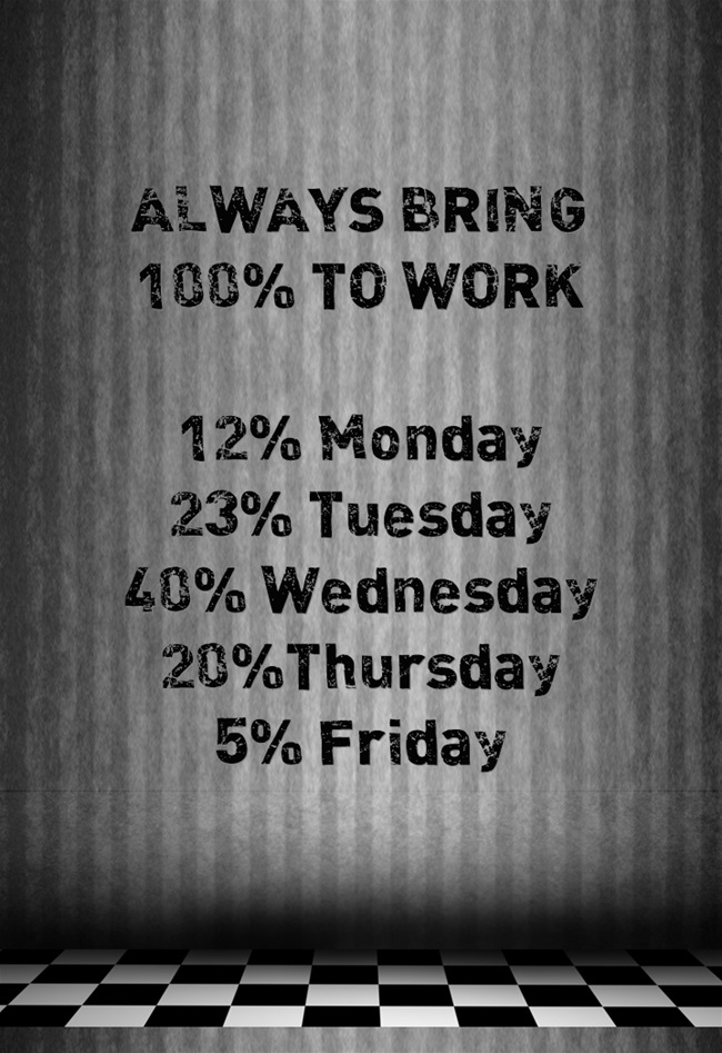Always Bring 100% to Work Share this:Tweet Click to share on Reddit (Opens in new window) Reddit Click to email a link to a friend (Opens in new window) Email Share on Tumblr Click to print (Opens in new window) Print Click to share on WhatsApp (Opens in new window) WhatsApp Like Loading...